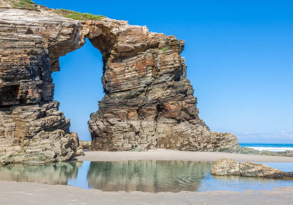Una hora más tarde nuestro autobús nos llevará hacia uno de los paisajes más impresionantes de Galicia: la Playa de las Catedrales. Conocida por su belleza natural esculpida por el mar, el viento y el tiempo, esta playa ofrece un espectáculo geológico de arcos y columnas que parecen catedrales naturales.