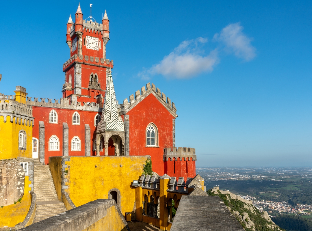 En lo alto de la sierra nos espera el colorido Palacio da Pena, máxima expresión del romanticismo portugués. Su arquitectura parece sacada de un cuento bávaro, con un aire misterioso gracias a la niebla que lo envuelve. Pasearemos por sus salones y sus exuberantes jardines que te atraparán por completo.