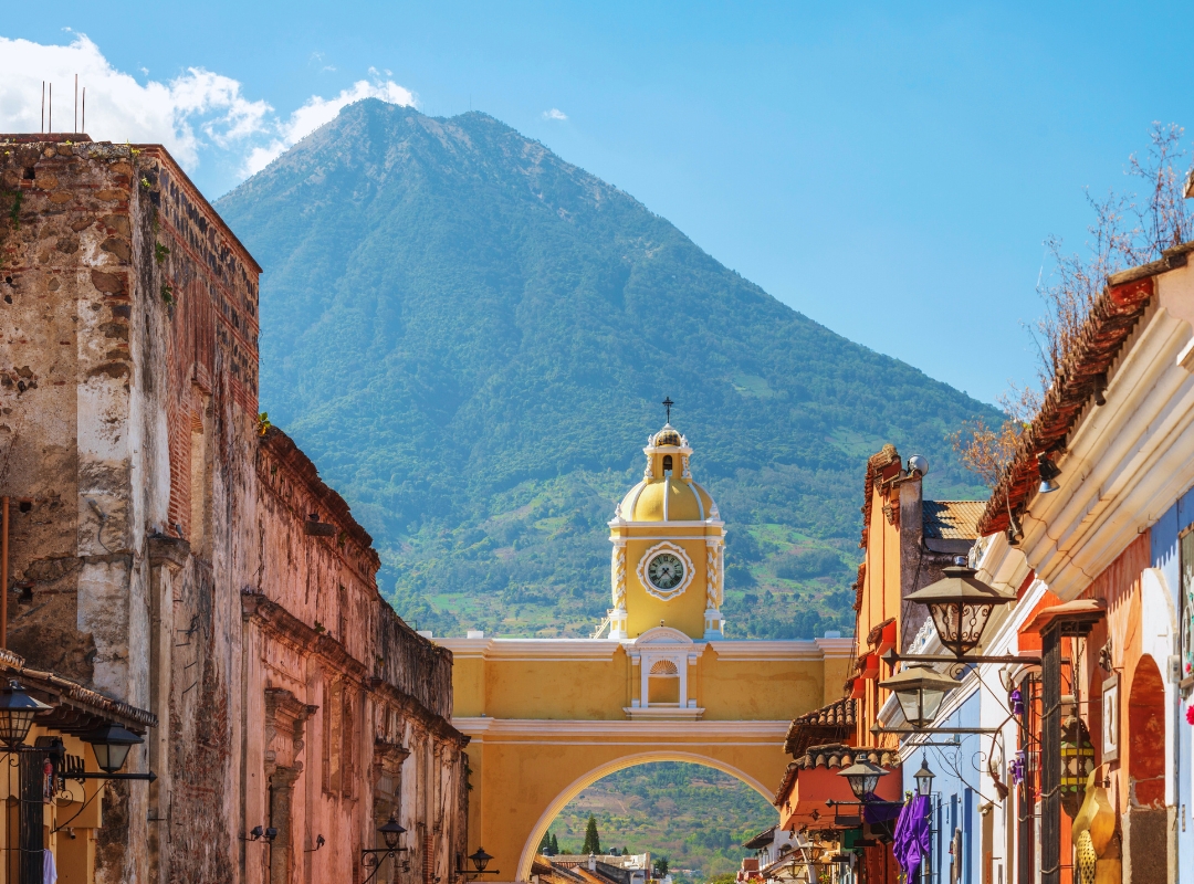 Hoy explorarás Antigua, una joya colonial declarada Patrimonio Cultural de la Humanidad por la UNESCO, que evoca la esencia de Trinidad en Cuba. Su encanto reside en sus calles adoquinadas y en los tres imponentes volcanes – Fuego, Acatenango y Agua – que la custodian.