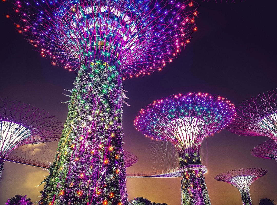 Cerramos el día en los impresionantes Gardens by the Bay, un icono mundial que nos transporta a un futuro sostenible y casi mágico. Sus súper árboles iluminados, los invernaderos gigantes y el ambiente futurista nos dejarán sin palabras, especialmente al anochecer. Un día completo que revela la diversidad, el alma cultural y el espíritu innovador de Singapur. Noche en Singapur.
