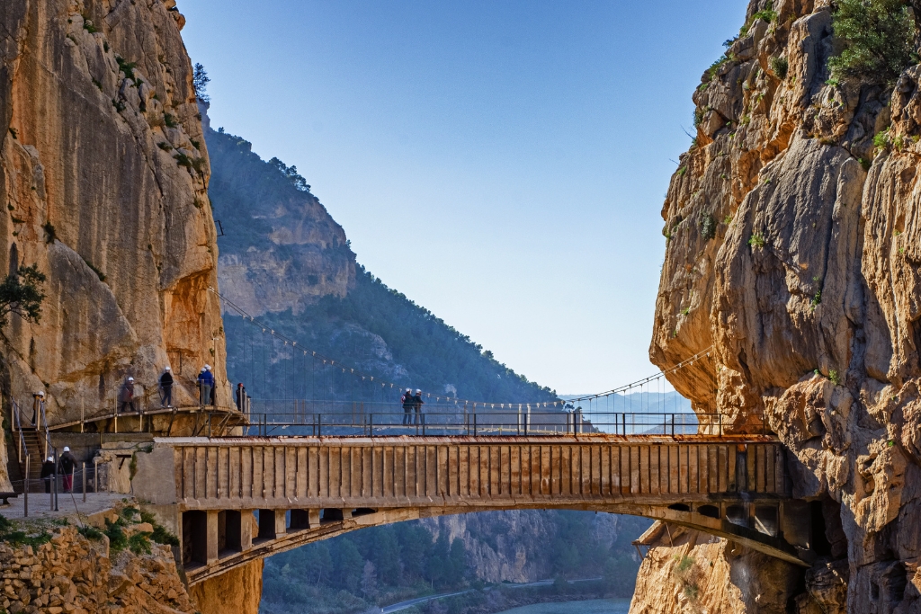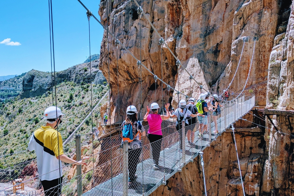 Después de coger energías, el autobús nos recogerá para participar en la actividad estrella de nuestro programa: el Caminito del Rey. Para contextualizar esta experiencia, es interesante saber que este camino icónico fue construido entre 1901 y 1905, inicialmente para transportar materiales y personas entre las centrales eléctricas a ambos lados de la espectacular garganta de El Chorro. En la década de 1920, el rey Alfonso XIII lo inauguró oficialmente y le dio su nombre, convirtiéndolo desde entonces en una de las maravillas de España.