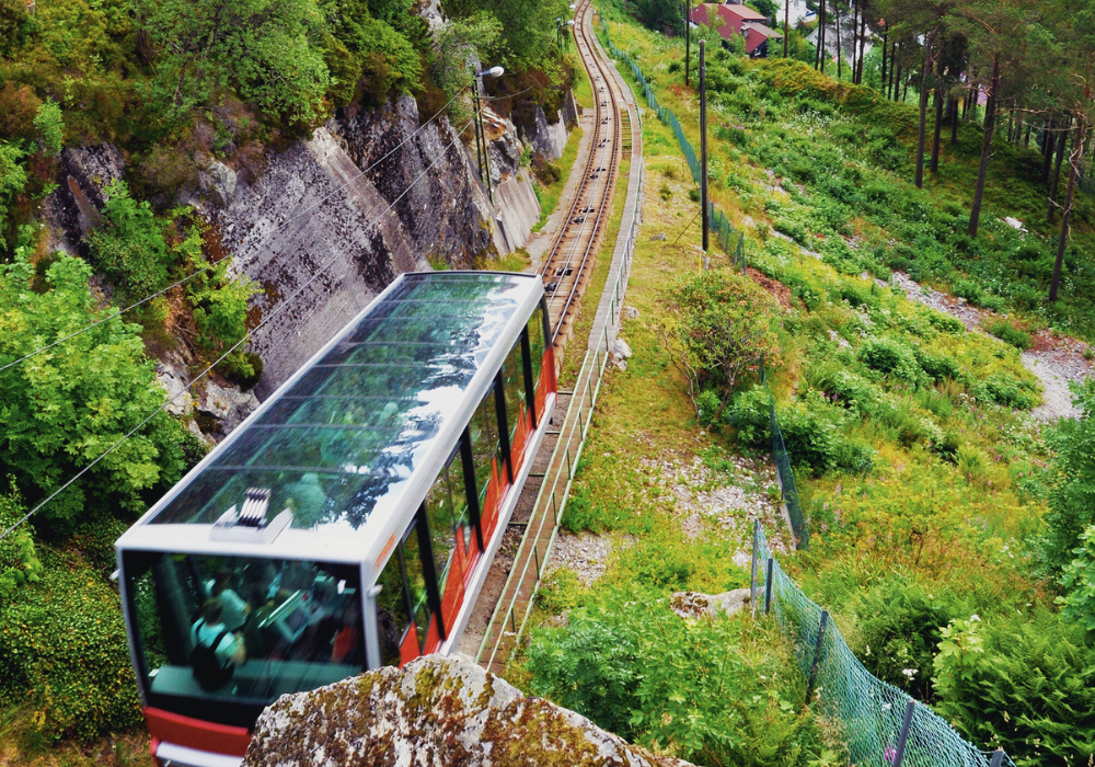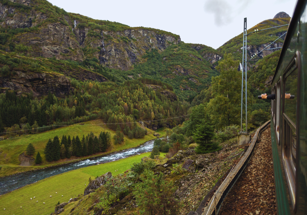 Montados en el tren de Fläm, una obra maestra de ingeniería, nos adentraremos entre paisajes de verdes montañas y asombrosa belleza natural.