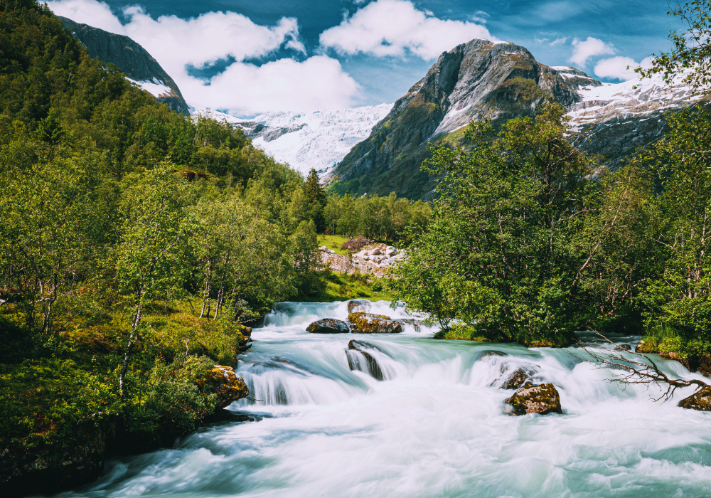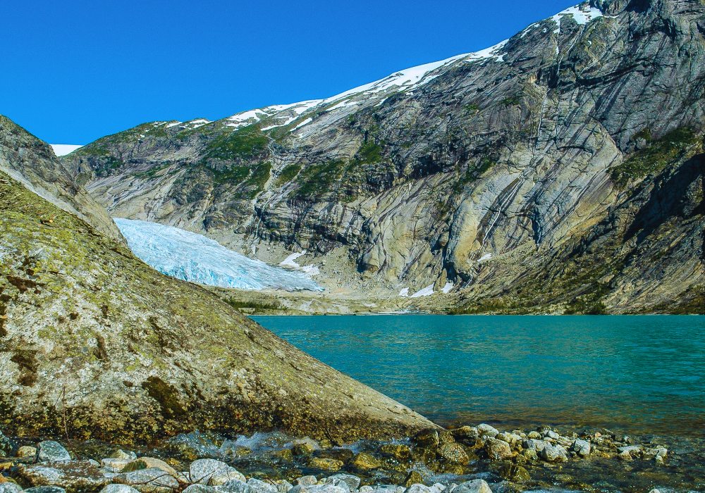 Nuestro recorrido comienza contemplando los paisajes de ensueño del Bøyabreen, un glaciar que se extiende entre montañas imponentes. Más adelante, nos acercamos al lago Jølstra, cuyas aguas cristalinas reflejan los picos nevados.