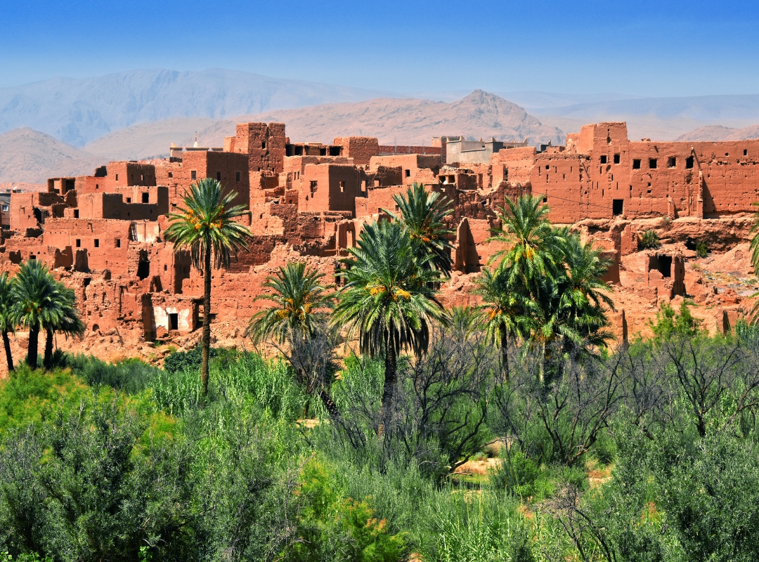 Tras la visita, continuaremos el viaje por la conocida Ruta de las Kasbahs, un recorrido emblemático jalonado por antiguas fortalezas de adobe rojo, muchas de ellas flanqueadas por cuatro torres. Estas construcciones tradicionales se integran a la perfección en el paisaje, rodeadas de verdes oasis, palmerales y pequeños pueblos, ofreciendo una de las imágenes más bellas del sur del país.