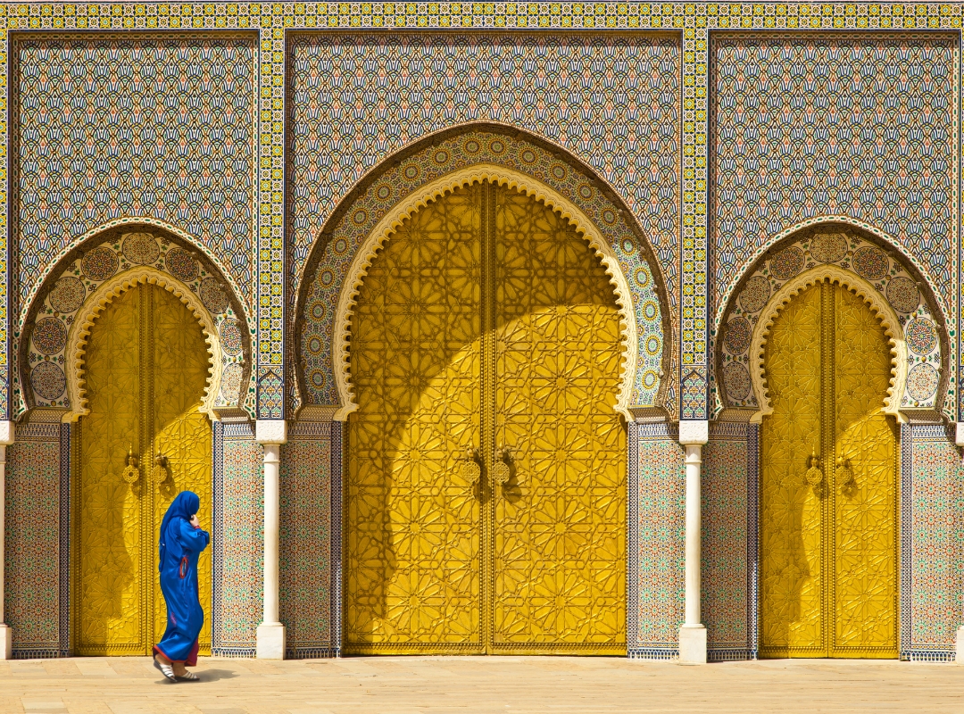 Iniciaremos la visita con una panorámica desde una de las colinas que rodean la ciudad, desde donde obtendremos una magnífica vista general. A continuación, nos detendremos ante las imponentes puertas de bronce del Palacio Real de Fez. Ya a pie, nos adentraremos en la fascinante Medina de Fez, la más grande del mundo, para visitar el interior de una medersa (centro de estudios coránicos), recorrer los talleres de los barrios artesanos organizados por gremios y descubrir el espectacular Barrio de los Curtidores, el mercado de las especias, el bullicioso zoco y la elegante Fuente de Nejarín.